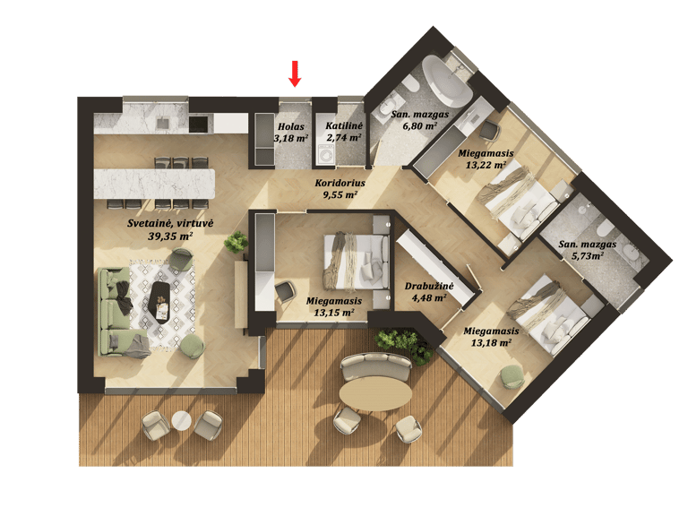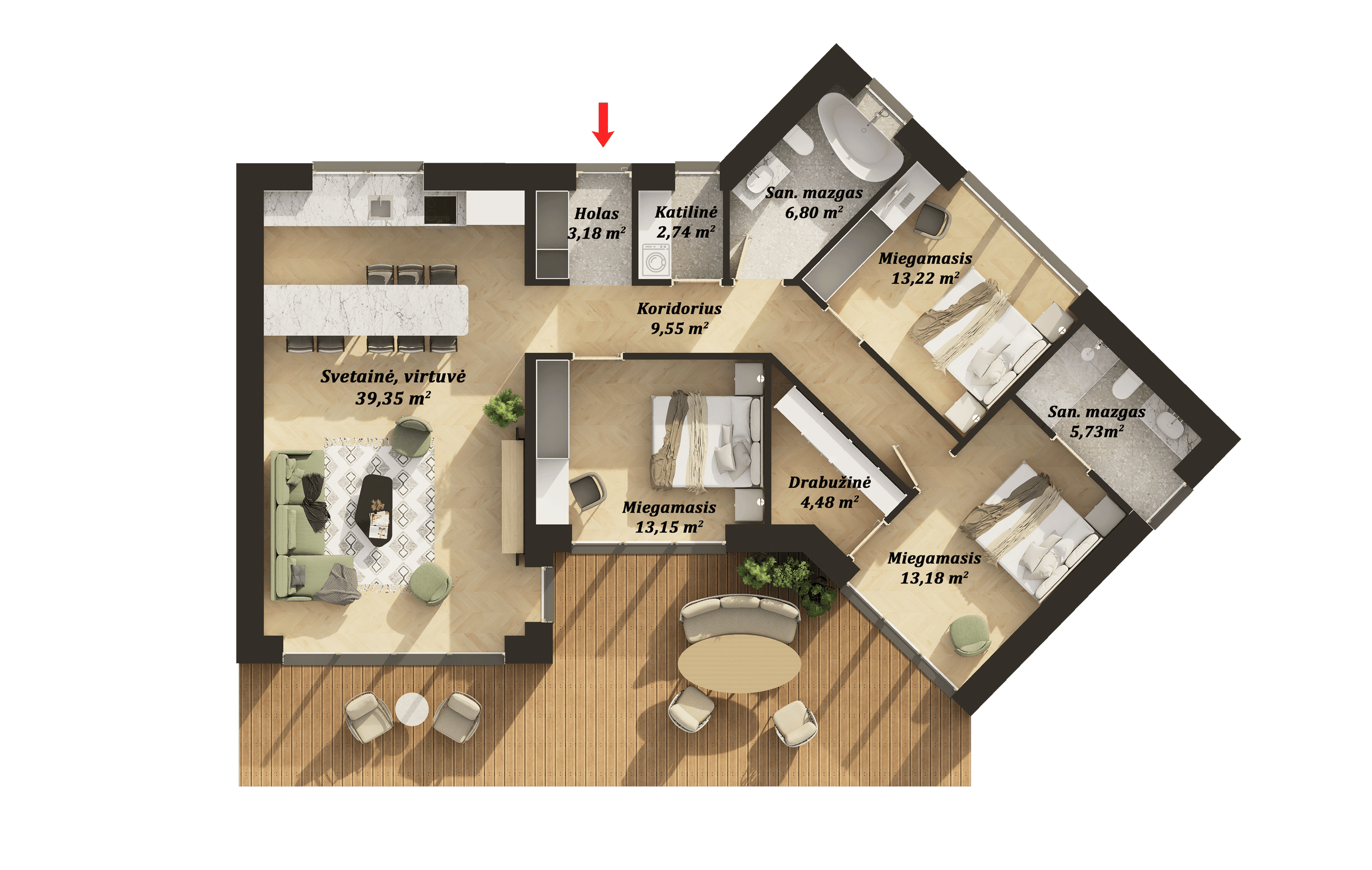 Namas turi tris miegamuosius, du sanitarinius mazgus, atskirą katilinę. Konstrukcija – mūrinė, stogas – plokščias. Namo plotas – 112 m², tinkamas 4–5 asmenų šeimai.